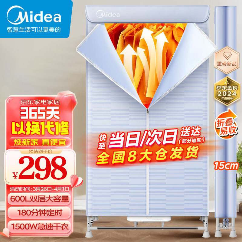 美的(Midea)【600L大容量】干衣机烘干机家用婴儿衣物暖风烘衣机风干机 升级可折叠设计 定时烘干衣柜HBGJ15C1价格:399.00元!