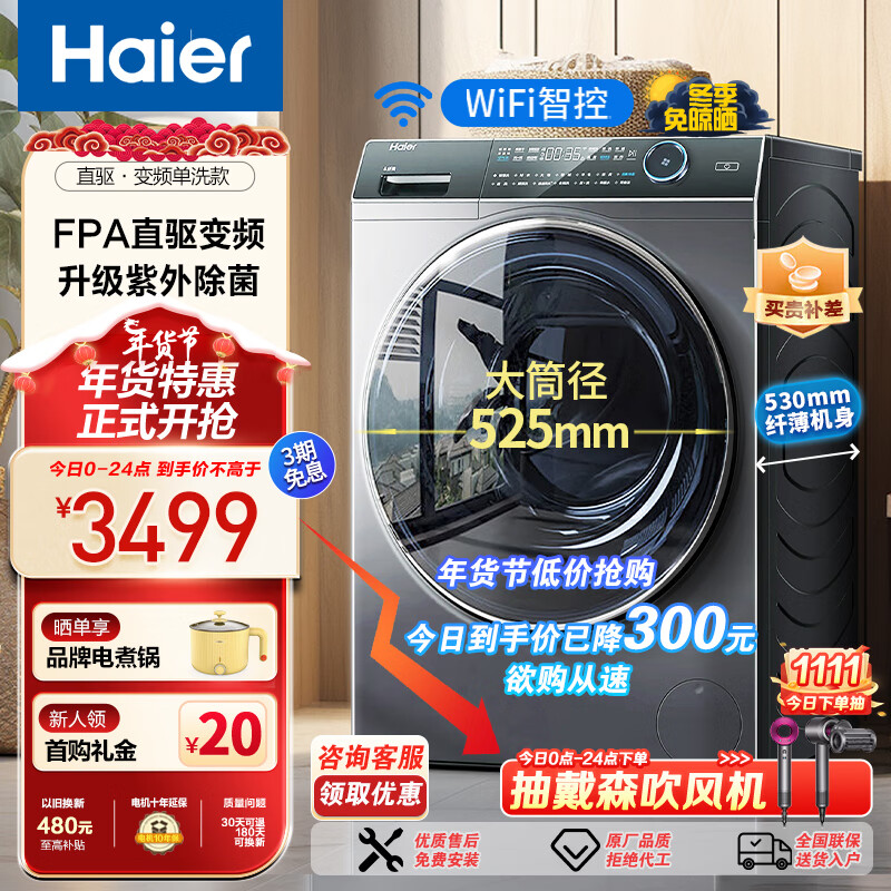 海尔(Haier)洗衣机10公斤超薄全自动滚筒直驱变频洗衣机智能投放紫外除菌WIFI智控525mm大筒径以旧换新价格:3459.00元!