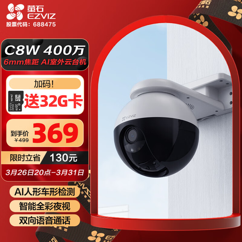 萤石 EZVIZ C8W 6mm 400万摄像头 无线WiFi室外双云台360° 防水防尘监控 手机远程 人形检测价格:369.00元!