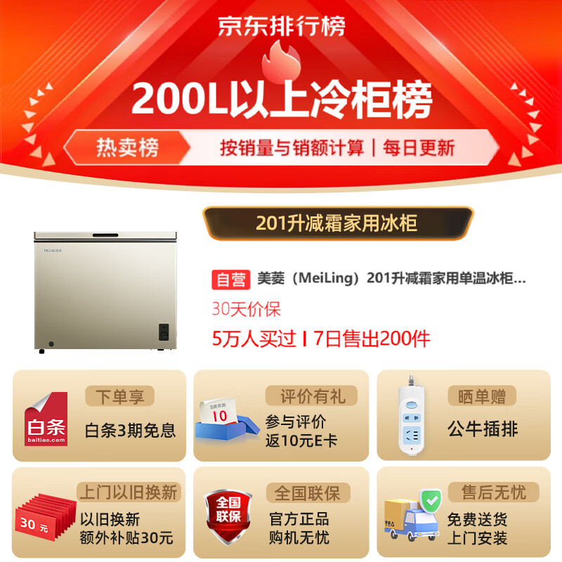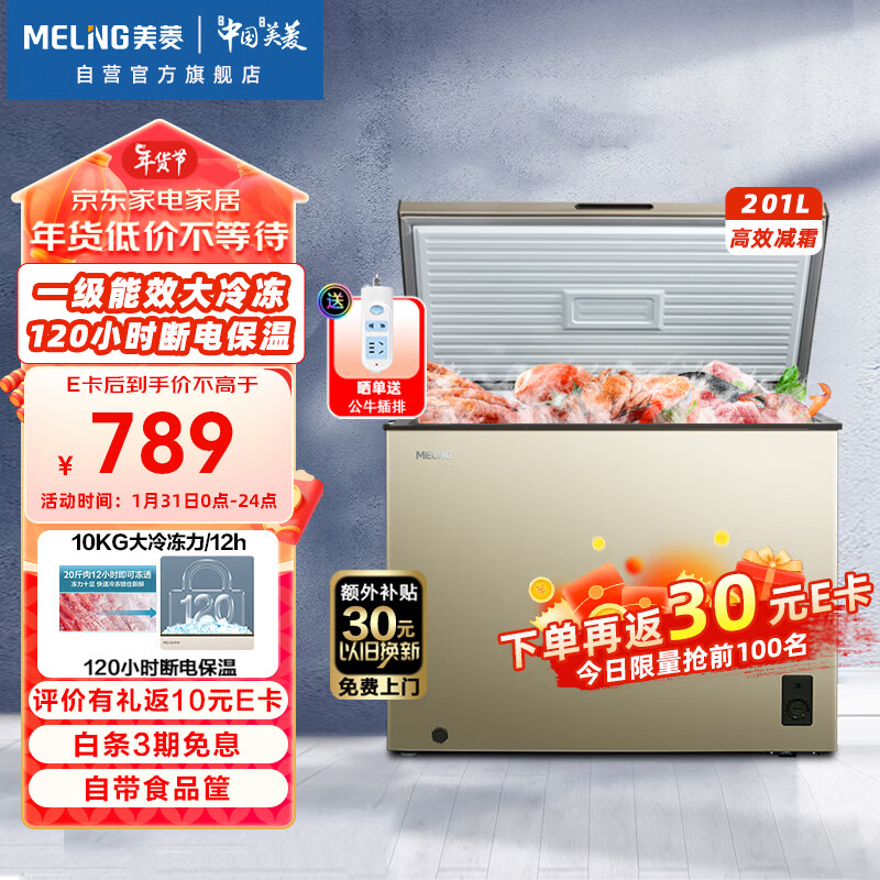美菱(MeiLing)201升减霜家用单温冰柜冷藏冷冻转换小冷柜小冰箱一级节能省电顶开门BC/BD-201DT金色以旧换新价格:819.00元!
