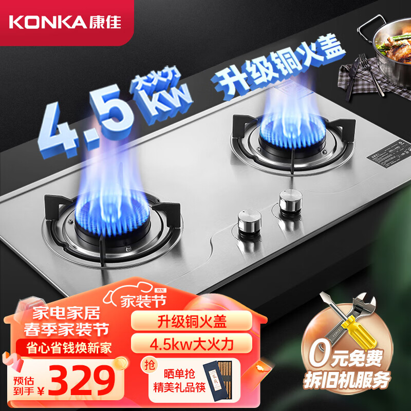 康佳(KONKA)燃气灶双灶具 4.5kW液化气煤气双灶 家用大火力台式/嵌入式不锈钢灶台 JZY-G420Y(液化气)价格:327.70元!