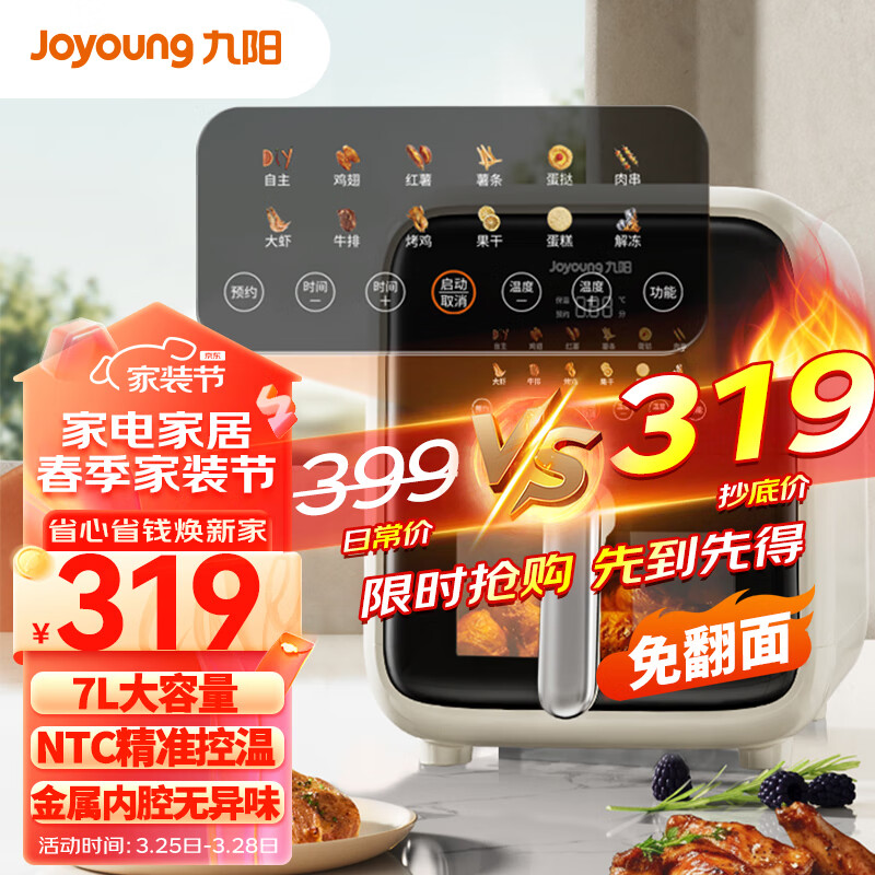 九阳(Joyoung)不用翻面 聚能寰顶 可视智能 蒸汽嫩炸空气炸锅 家用7L大容量 薯条机电炸锅 KL70-V595价格:319.00元!