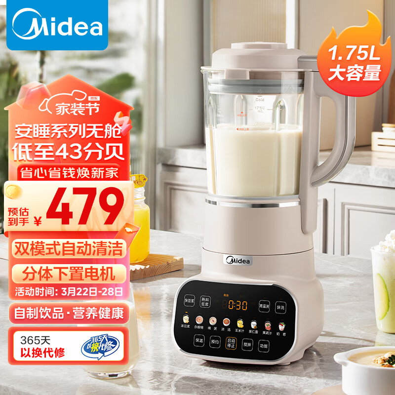 美的(Midea)低音破壁机安睡SE 家用榨汁机 豆浆机 多重降噪 双模式自动清洗1.75升大容量MJ-PB12S49价格:489.00元!