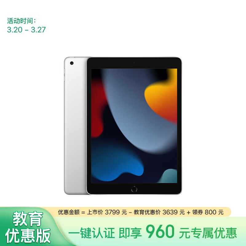 Apple/苹果【教育优惠】iPad 10.2英寸平板电脑 2021款(256GB WLAN版/MK2P3CH/A)银色价格:3639.00元!