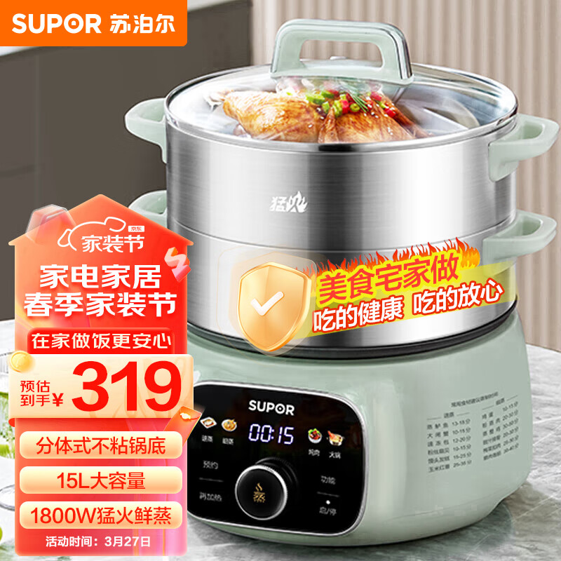 苏泊尔(SUPOR)电蒸锅 电煮锅 电火锅 家用多功能蒸包子锅 15升大容量电热锅 分体式可拆洗多用途锅ZN28YC908价格:309.00元!