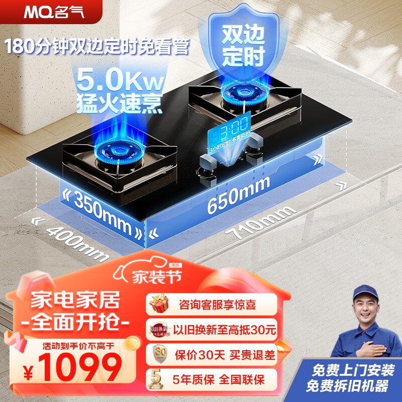 名气(MQ)老板燃气灶天然气 家用嵌入式5.0KW大火力猛火灶 180min智能定时双灶 可调节底盘灶具 JZT-A6820B价格:1099.00元!