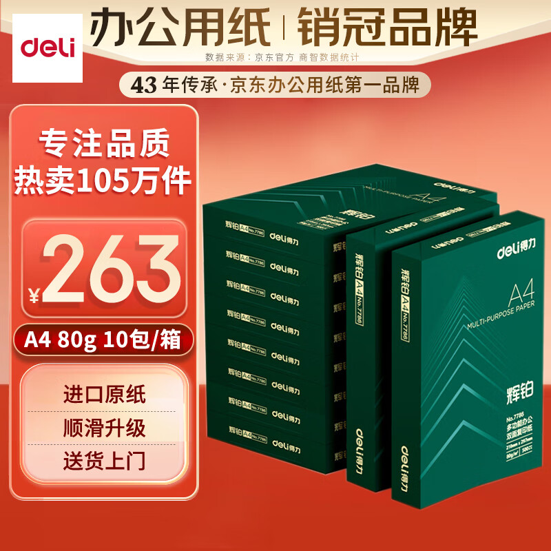 得力(deli)辉铂A4打印纸 80g500张*10包一箱 进口原纸复印纸 双面加厚顺滑打印 整箱5000张 7799【品质升级】价格:263.00元!