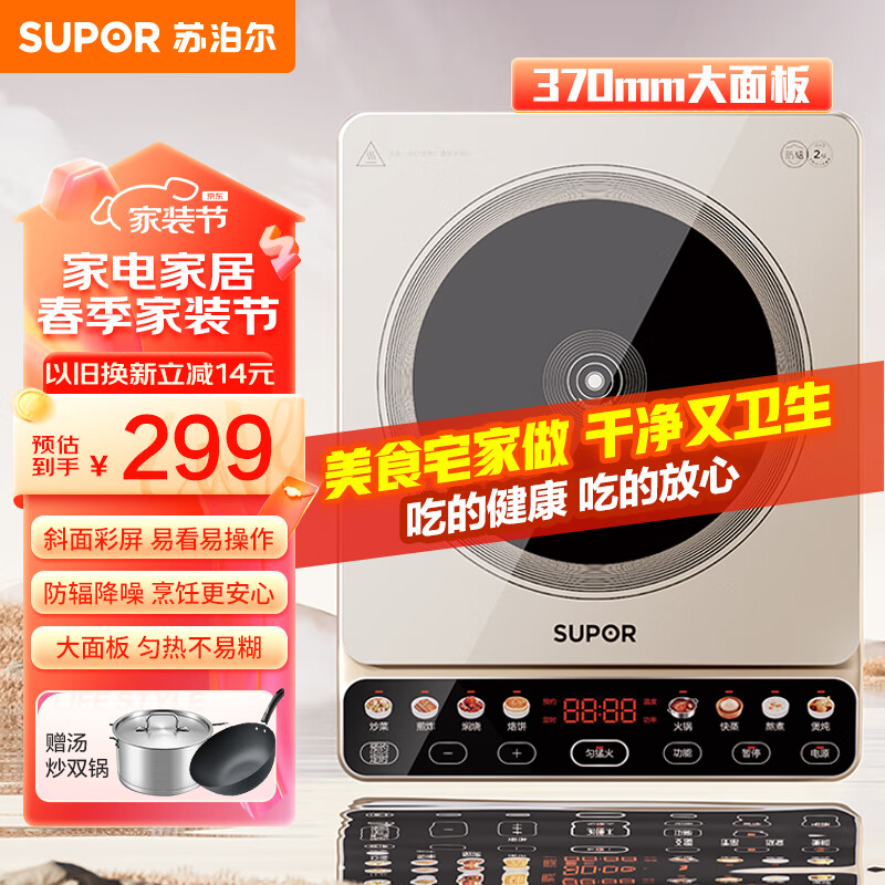 苏泊尔(SUPOR)家用电磁炉 2200W大功率大面板 防辐减噪 爆炒炒菜 智能定时功能 电磁灶 火锅炉套装带锅C22-IA813价格:289.00元!