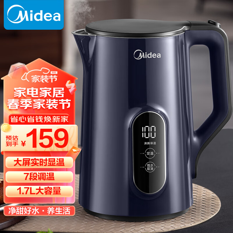 美的(Midea)电水壶热水壶1.7L大容量不锈钢保温双层触控防烫多段控温开水壶家用双煮水养生恒温烧水壶SHE1733价格:159.00元!