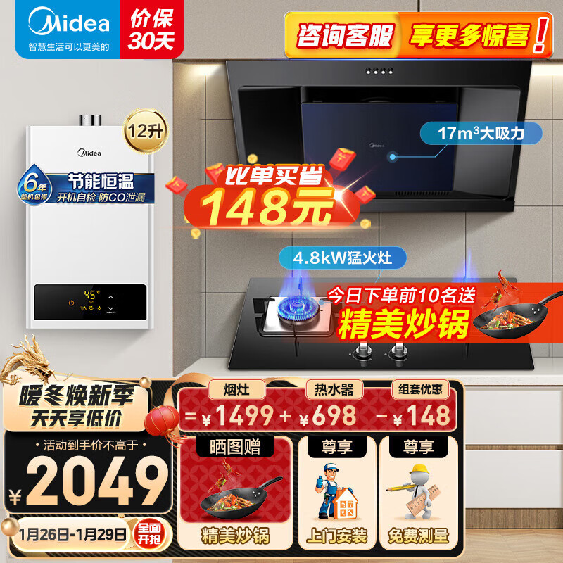 美的(Midea)侧吸抽油烟机灶具烟灶多件套装燃气热水器家用烟灶燃热厨房三件套JP11+Q217B+12HWF天然气价格:2049.00元!