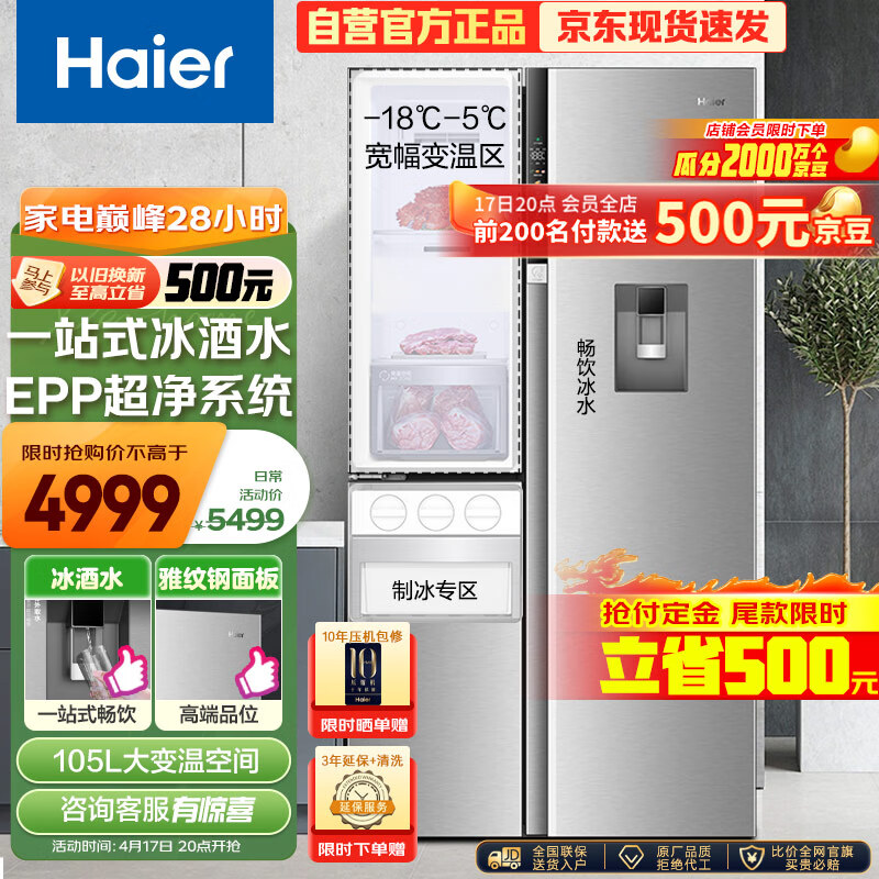 海尔585升侧T型双门三开门电冰箱家用一级能效变频节能无霜除菌全温区嵌入式可制冰BCD-585WGHFTH7S7U1价格:4999.00元!