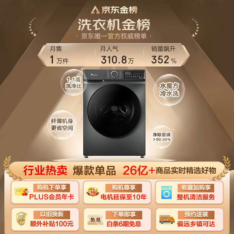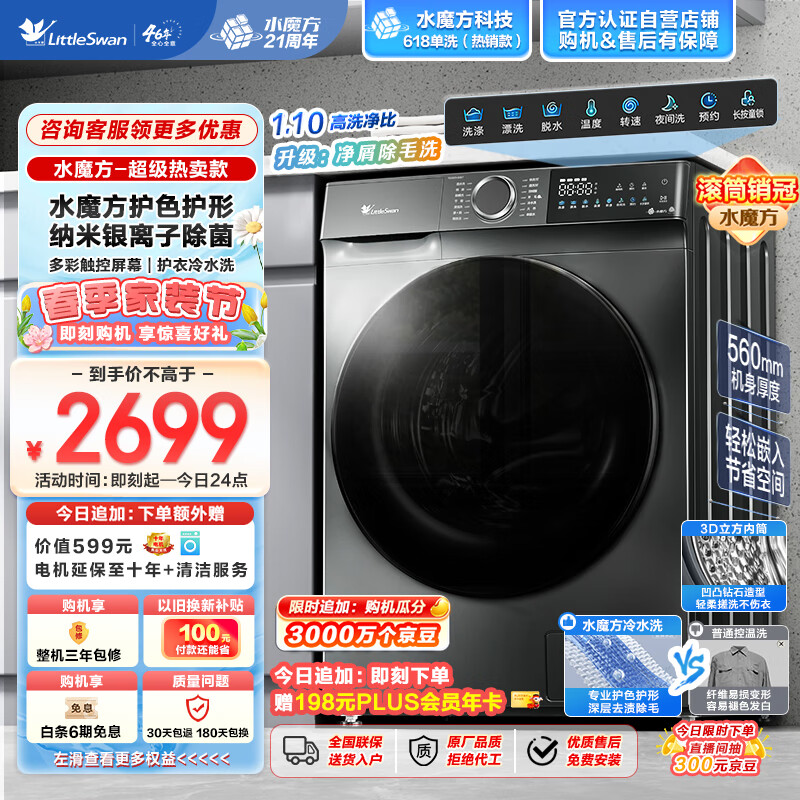 小天鹅(LittleSwan)滚筒洗衣机全自动 10公斤大容量 水魔方 变频智能彩屏 银离子除菌除螨1.1高洗净比 TG100V618T价格:2699.00元!