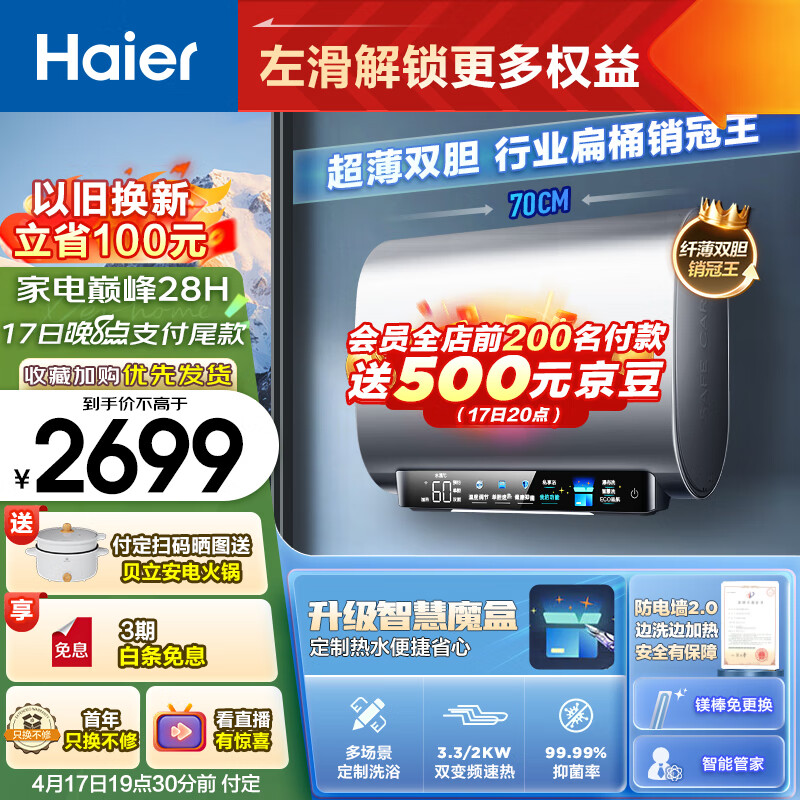 海尔(Haier)60升【小魔盒】定制洗浴超薄扁桶双胆家用电热水器3300W变频速热镁棒免更换WiFi智能EC6003-BK3KU1价格:2698.00元!