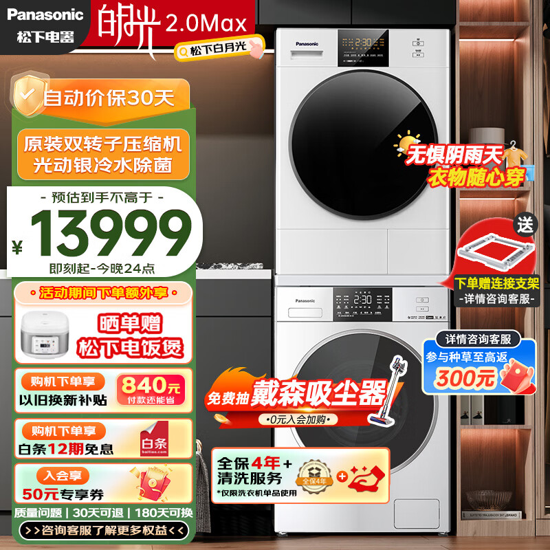 松下(Panasonic)白月光2.0Max 大容量 洗烘套装 12kg滚筒洗衣机+10kg热泵烘干机 冷热除菌 智能投放 3NB1E+EH1015价格:13999.00元!