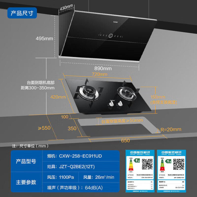 烟机安装尺寸:900±50mm