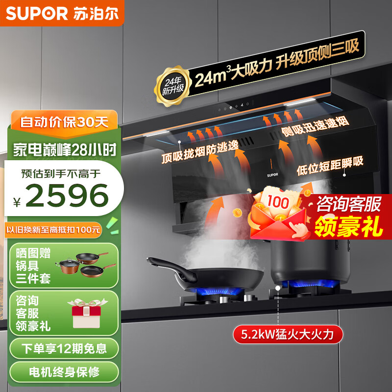 苏泊尔(SUPOR)抽油烟机 双腔拢烟顶侧双吸油烟机套装 24立方大吸力变频烟灶 油烟机燃气灶 DL35+DB2Z7S液化气价格:2596.00元!