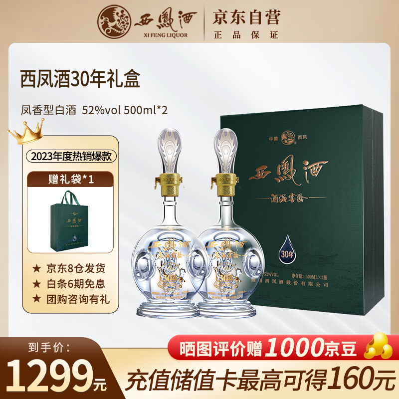 西凤酒 30年 52度 双支礼盒 陈年凤香型白酒 高端年份 送礼收藏价格:1299.00元!