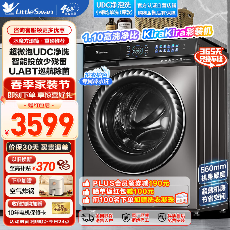 小天鹅(LittleSwan)滚筒洗衣机全自动 水魔方防缠绕小钢炮UDC净泡洗 智能投放 护色护形一级变频VC189【V88升级款】价格:3599.00元!