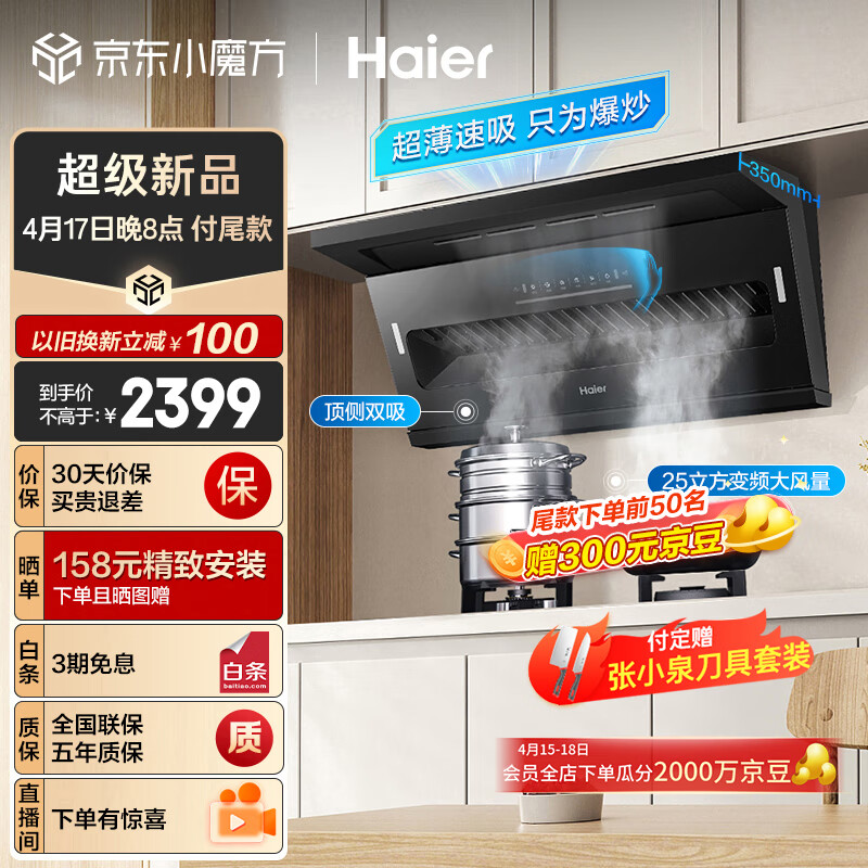 海尔(Haier)抽油烟机 顶侧双吸 7字型家用排烟机 25m3/min大吸力 齐平橱柜 挥手智控 自动清洗排吸烟机C61价格:2399.00元!