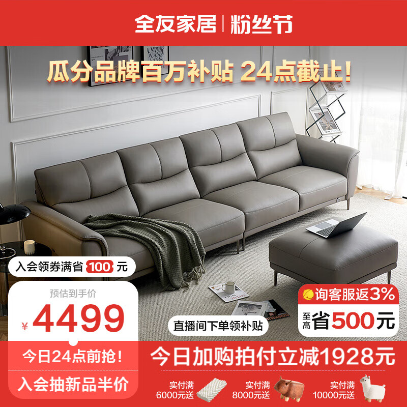 全友家居 直排式真皮沙发客厅现代简约头层牛皮一字皮艺沙发112011价格:6427.14元!