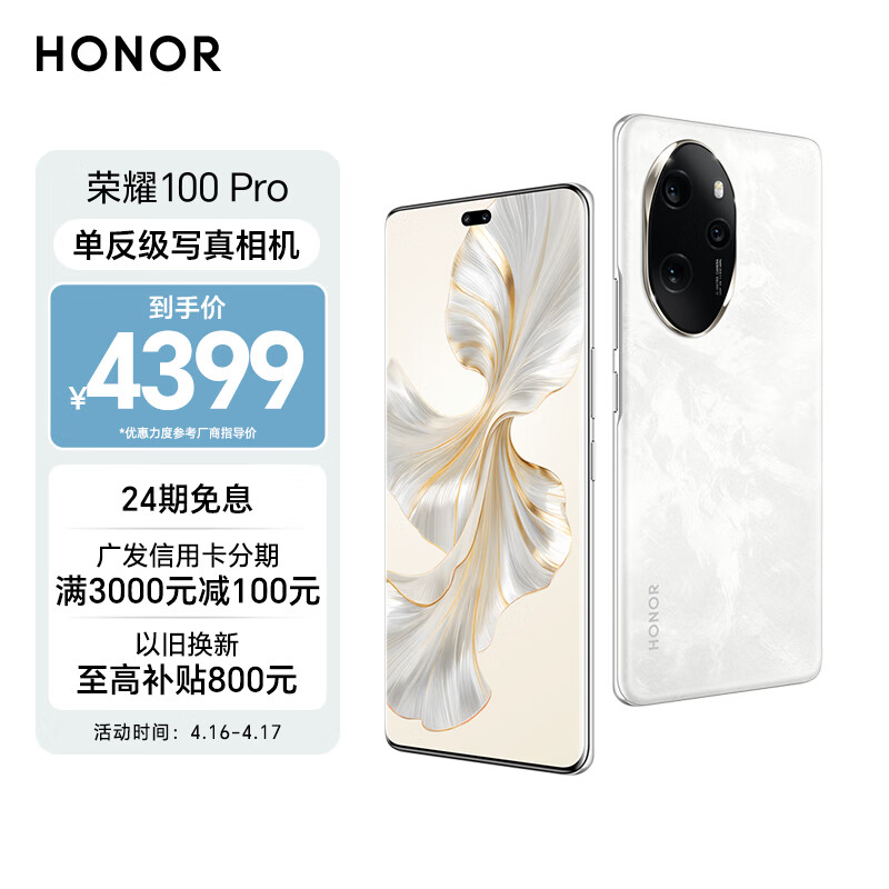 荣耀100 Pro 单反级主摄 荣耀绿洲护眼屏 第二代骁龙8旗舰芯片 立体声双扬声器 OIS 16+1T 月影白 5G价格:4399.00元!