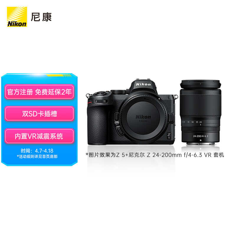 尼康(Nikon)Z5全画幅微单相机 数码相机 微单套机 ( Z 24-200mm f/4-6.3 VR 微单镜头)Vlog相机价格:14029.00元!
