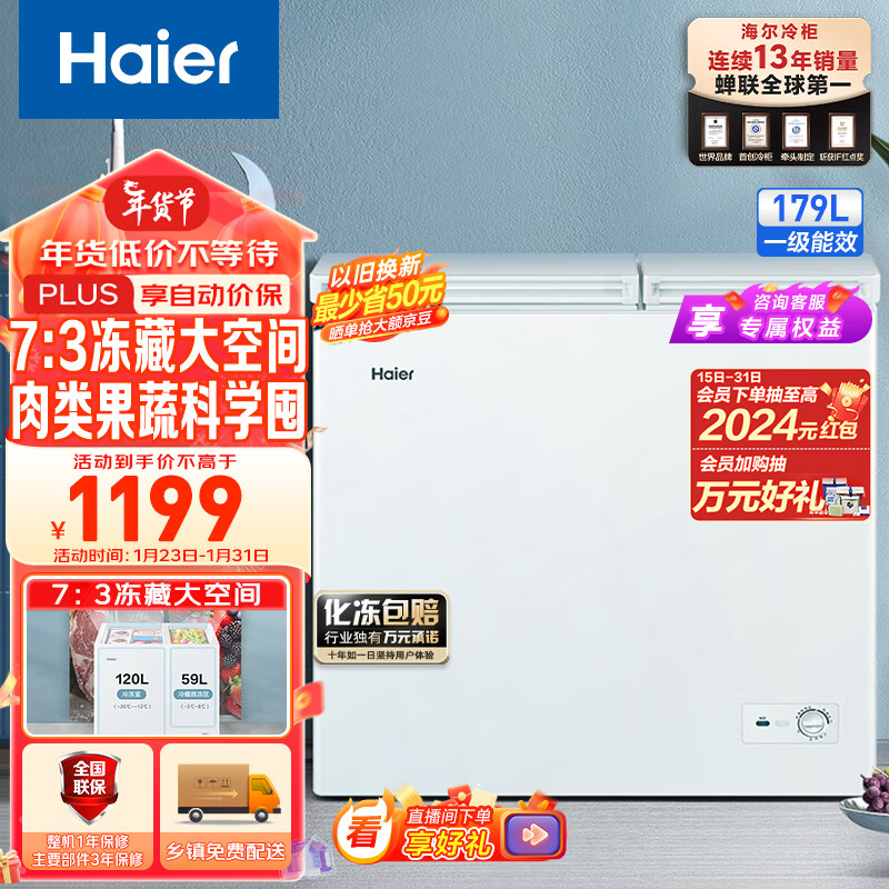 海尔(Haier)179升双箱双温商用家用冰柜 大冷冻小冷藏卧式冰柜家用小型冰箱冷柜FCD-179GHXD 以旧换新价格:1199.00元!
