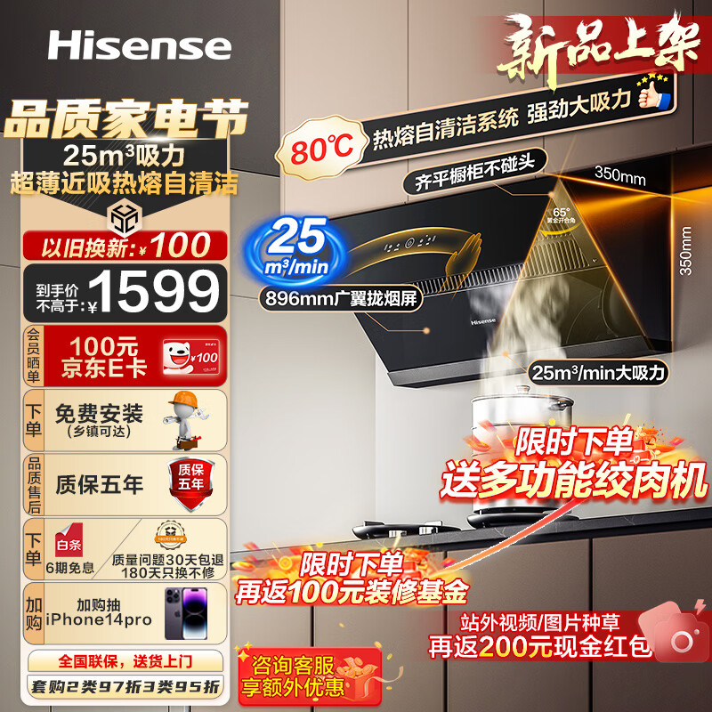 海信(Hisense)海信抽油烟机小魔方超薄近吸家用平嵌侧吸式油烟机 25立方大吸力挥手智控热熔洗排烟机S1以旧换新价格:2199.00元!