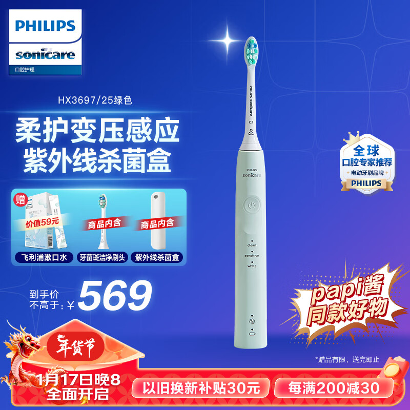 飞利浦(PHILIPS)【papi酱自用好物】电动牙刷成人 健康护龈系列3种模式7倍清除牙菌斑 绿色HX3697/25 送礼新年礼物价格:649.00元!