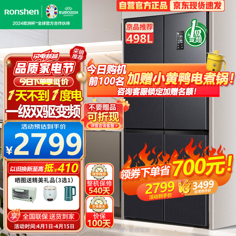 容声(Ronshen)498升四开门十字对开冰箱家用一级双变频风冷双循环送风防串味无霜超薄嵌入生态养鲜价格:3499.00元!