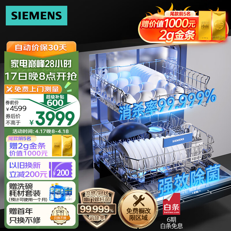 西门子14套大容量除菌消毒 独嵌两用晶洗舱洗碗机嵌入式 加强烘干 下层强洗 洗消烘存一体 SJ23HB66KC价格:4599.00元!