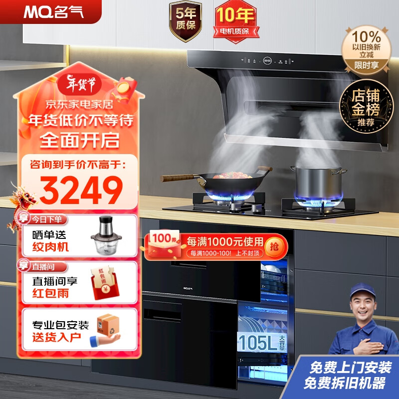 名气(MQ)老板抽油烟机烟灶套装7字型23吸力风量吸油烟机燃气灶消毒柜家用烟灶消三件套5505A+6312BT+x101价格:3249.00元!
