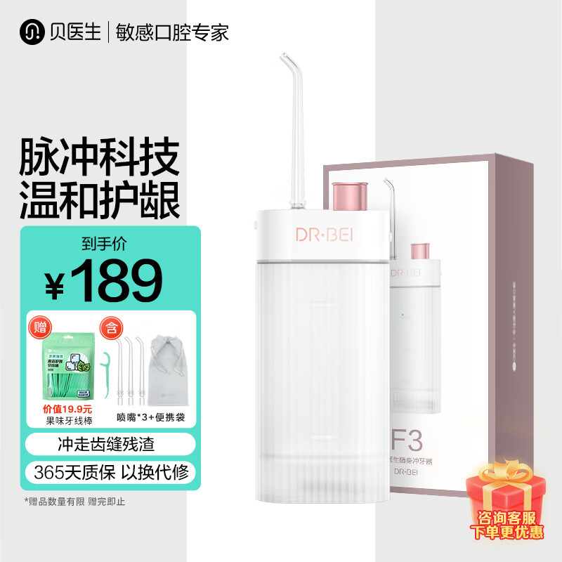 贝医生(DR·BEI) 正畸冲牙器便携家用洗牙器洁牙器水牙线清洁口腔牙套 国货旅行洗漱套装 清洁亮白护龈 送女友礼物 冲牙器F3【内配3喷嘴】 3支喷头价格:289.00元!
