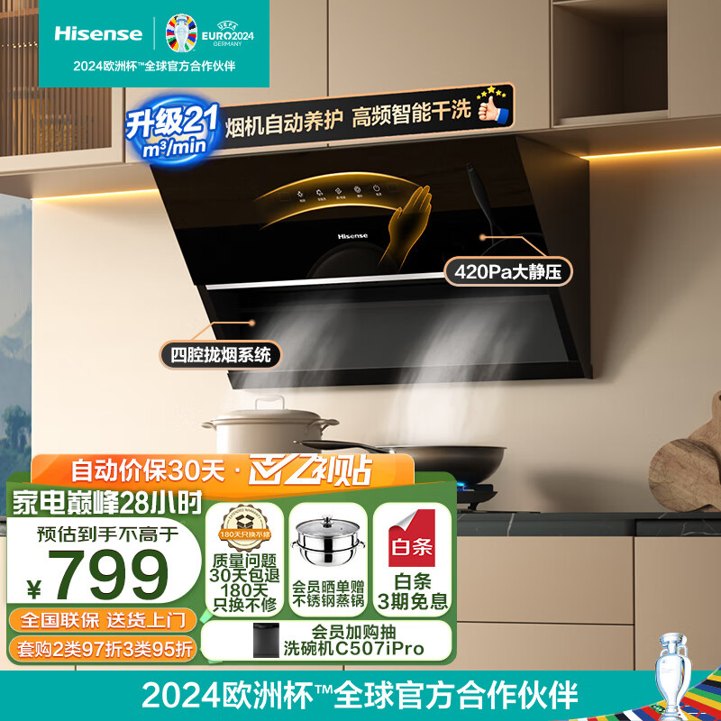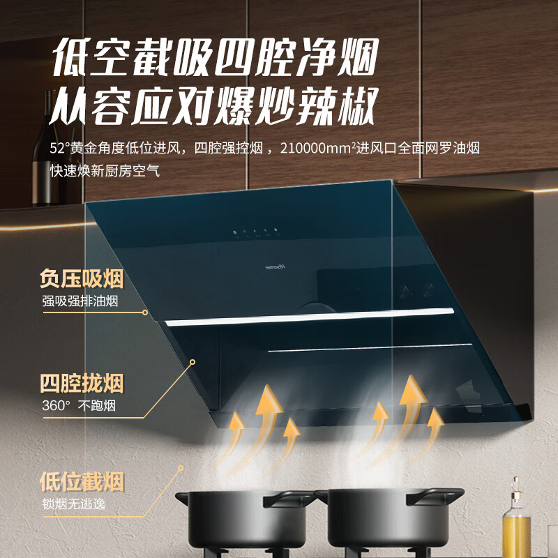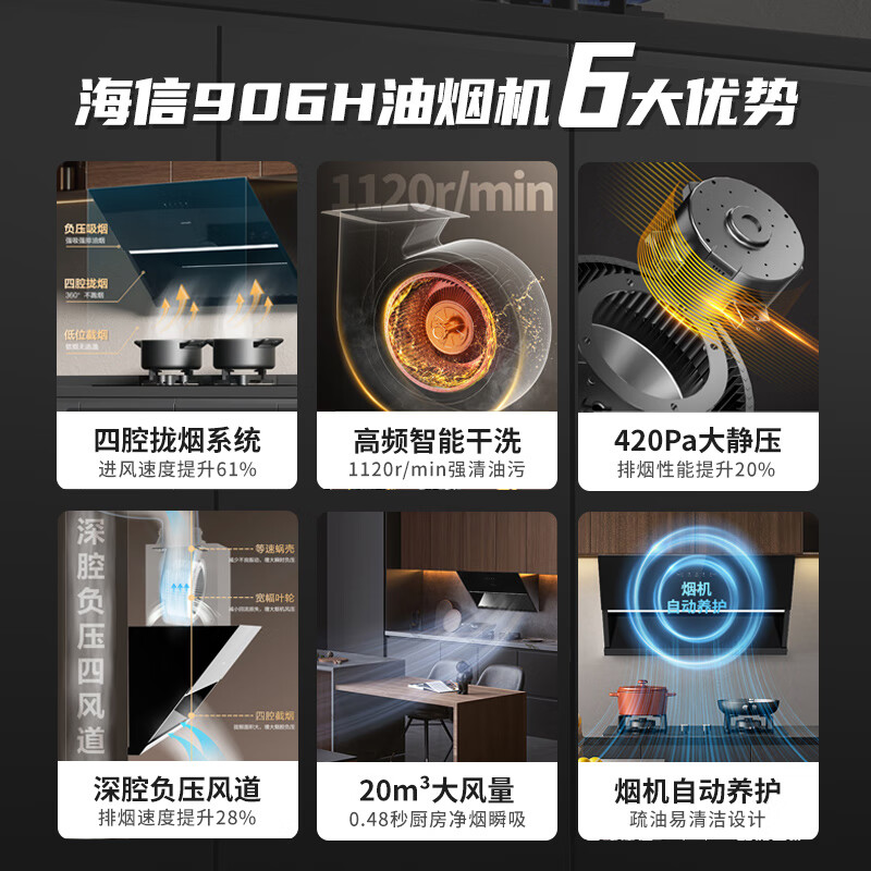 海信(Hisense)家用抽油烟机 侧吸式吸油烟机 21立方大吸力 四腔拢烟 自动清洗 脱排油烟机以旧换新DJ906H价格:799.00元!