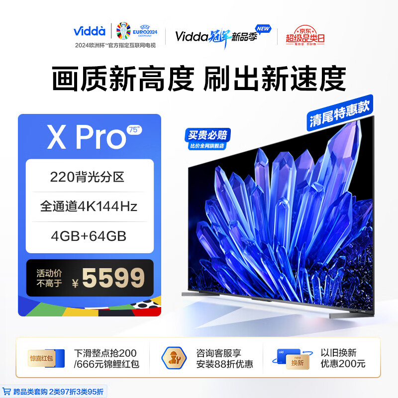 Vidda 海信电视 X75 Pro 75英寸 144Hz游戏电视 220背光分区 4+64G 智能屏巨幕以旧换新75V3K-PRO价格:5599.00元!