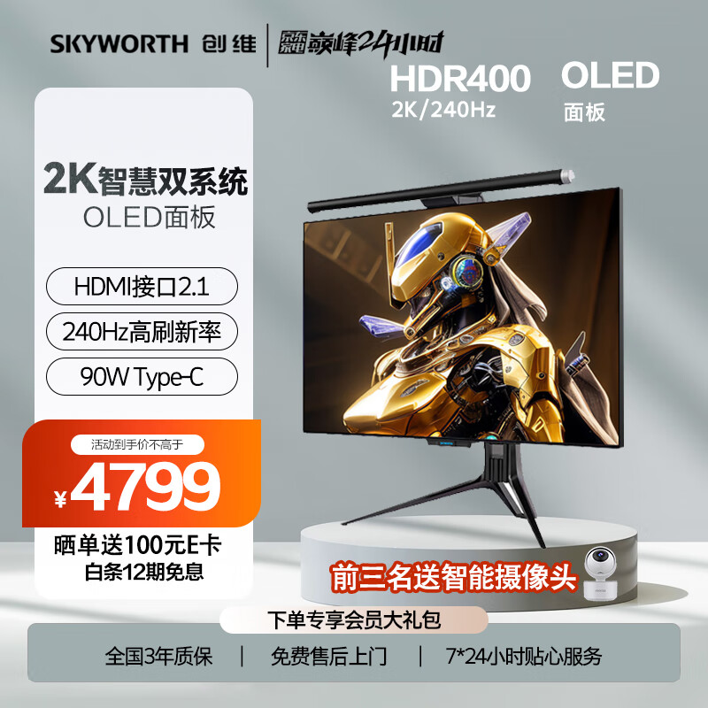 创维 26.5英寸 OLED 电竞显示器 2K 240Hz 无线投屏 90W Type-C 杜比认证 双系统 标配挂灯 F27G80Q价格:5999.00元!