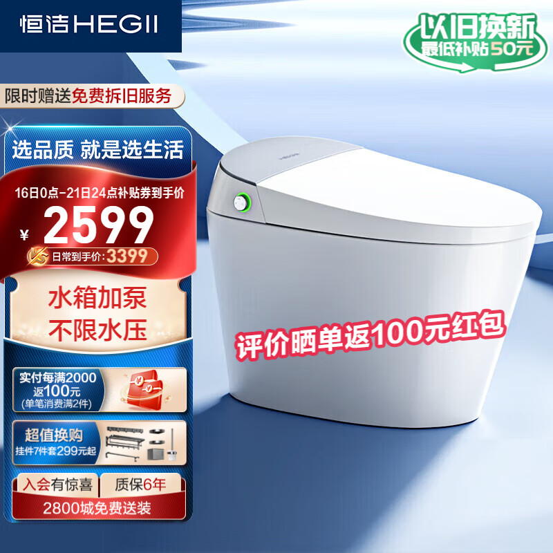 恒洁(HEGII)智能马桶H33 内置水箱不限水压抗菌智能坐便器HCE865A01-305mm价格:3659.00元!