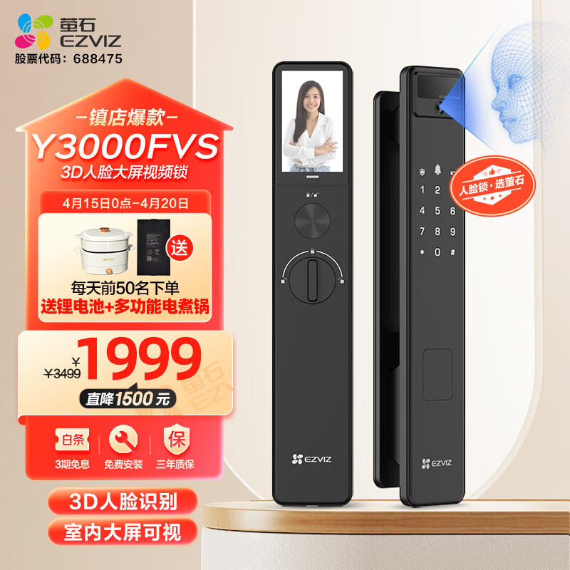 萤石Y3000FVS智能锁 静谧黑 3D人脸识别无需指纹 室内4英寸可视大屏 家用全自动猫眼门铃防盗视频锁价格:1999.00元!