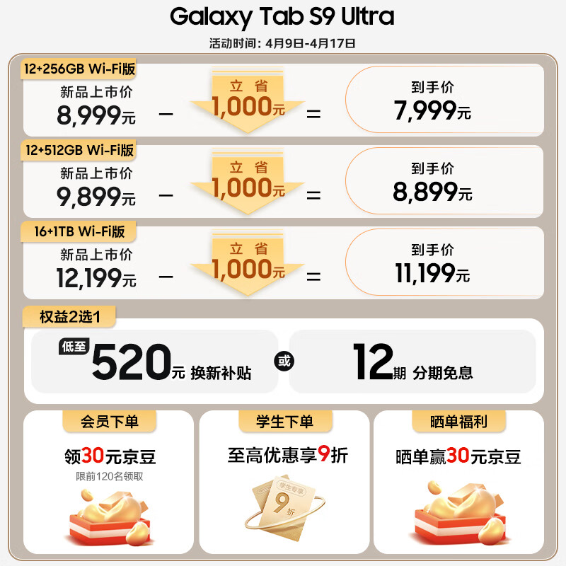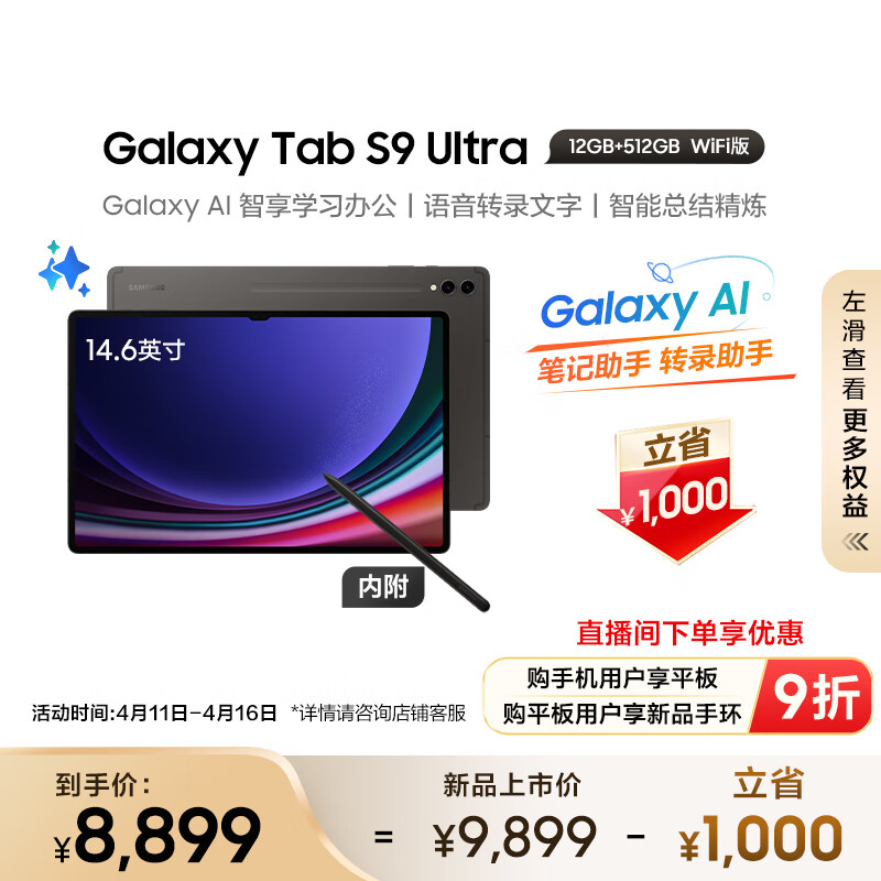 三星(SAMSUNG)S9 Ultra Al智享学习办公平板电脑14.6英寸 120Hz 12G+512GB WIFI版 AI平板 云影灰价格:8899.00元!