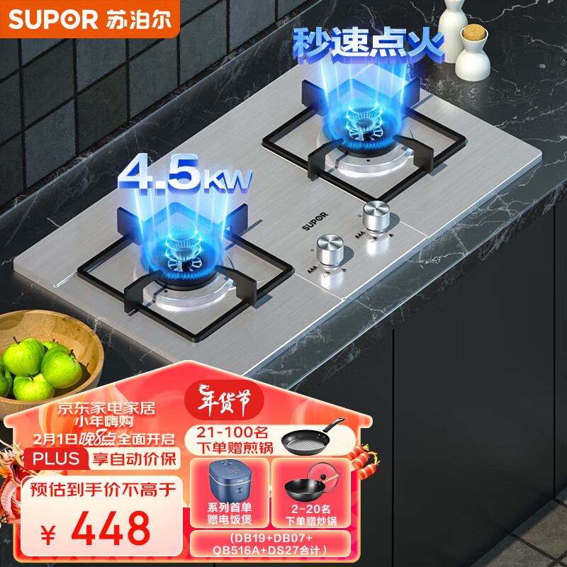 苏泊尔(SUPOR)燃气灶双灶家用 天然气灶双灶具4.5kW火力 不锈钢面板 家用嵌入式台式两用灶台灶具 DS27天价格:399.00元!