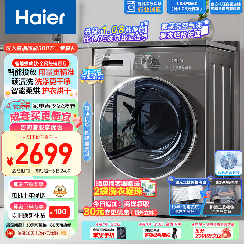 海尔(Haier)滚筒洗衣机全自动 洗烘一体机 10公斤大容量【EG100HMATE55S】1.08洗净比 智投 超薄家用 以旧换新价格:2699.00元!