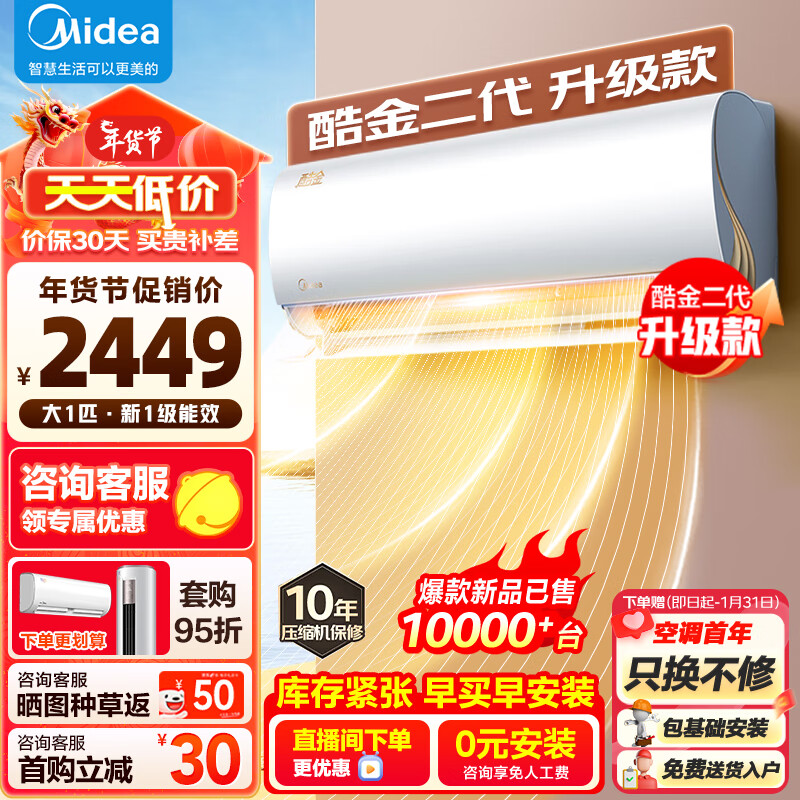 美的(Midea)空调大1匹挂机 酷金二代升级版 新一级能效 节能省电 壁挂式 卧室书房智能空调 KFR-26GW/N8ZHA1Ⅱ价格:2449.00元!