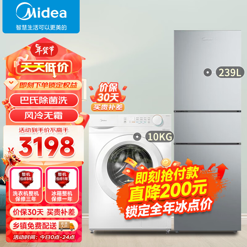 美的冰洗套装 239升三门家用风冷无霜+10公斤滚筒洗衣机全自动蒸汽除菌 BCD-239WTM+MG100V11F价格:3198.00元!