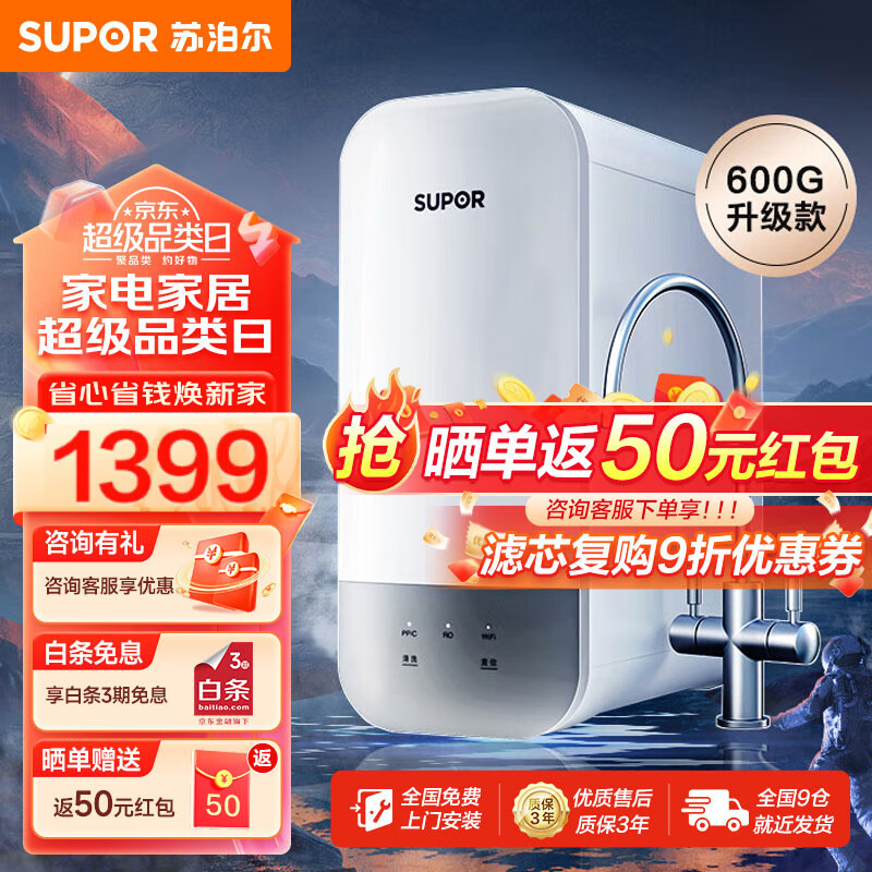 苏泊尔(SUPOR)净水器家用直饮机RO反渗透纯水机600G大通量过滤器UR30滤水器厨下软水机厨房净水机价格:1399.00元!