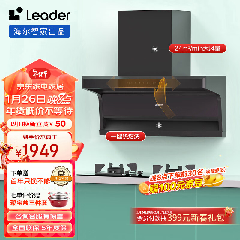 Leader海尔智家出品 顶侧双吸抽油烟机 升级24m3/min大吸力 挥手智控 自清洁烟灶套装IQ92D+QIGL2D价格:1949.00元!