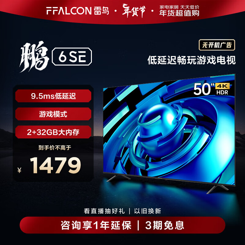FFALCON雷鸟 鹏6SE 50英寸游戏电视 4K超薄屏 MEMC防抖 远场语音 2+32G 智能液晶平板电视机50S365C价格:1479.00元!