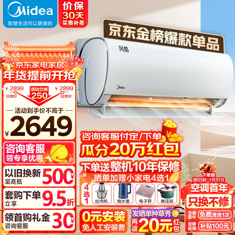 美的(Midea)空调 1.5匹 风酷 新一级能效变频冷暖智能家电 壁挂式空调挂机 KFR-35GW/N8XHC1Ⅱ 多仓直发价格:2649.00元!