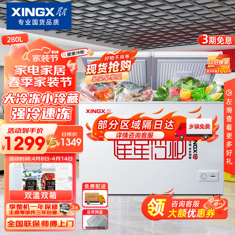 星星(XINGX) 280升 商用卧式冰柜 左冷冻右冷藏 卧式冰箱 顶开门双温双箱冷柜 BCD-280E价格:1299.00元!
