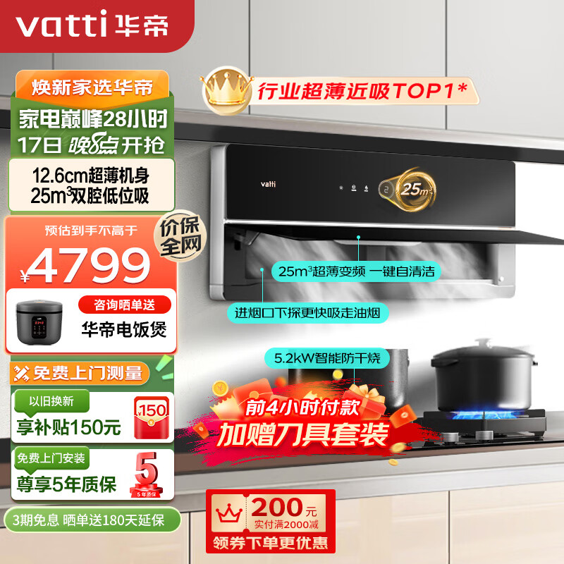 华帝(VATTI)抽油烟机超薄近吸理想家X6家用变频大吸力烟机防干烧燃气灶具烟灶套装25风量自动清洗i11210天然气价格:4798.00元!