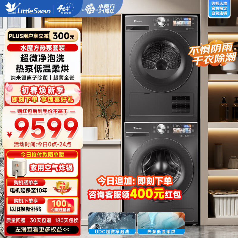 小天鹅洗护套装10公斤超薄全嵌水魔方滚筒洗衣机+大容量热泵烘干机 紫外线除菌TG100M28T+TH100-H28WT价格:9999.00元!